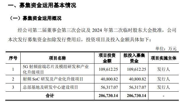 据短平快解读了解,本次IPO,昂瑞微拟公开发行不超过2,488.2922万股,拟募集资金206,730.14万元,用于5G射频前端芯片及模组研发和产业化升级项目、射频SoC研发及产业化升级项目以及总部基地及研发中心建设项目,拟投入募集资金分别为109,612.25万元、40,800.82万元、56,317.07万元。