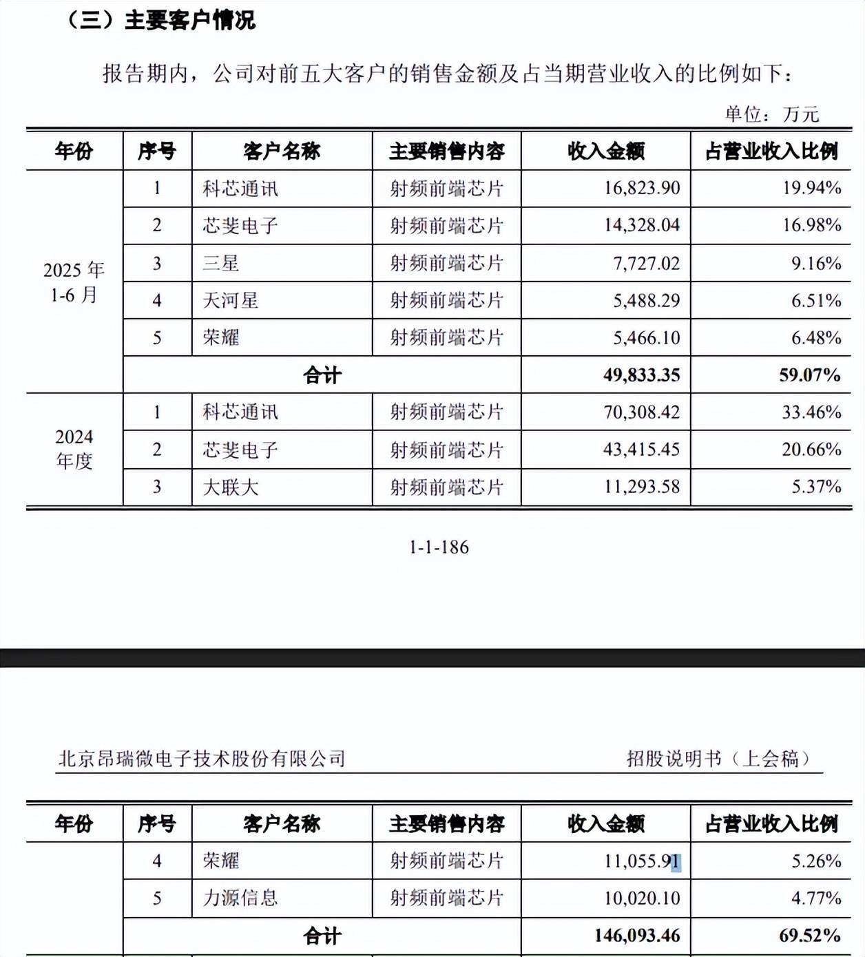 客户集中度较高。报告期内,昂瑞微对前五客户的销售额分别为6.5亿元、12.85亿元、14.61亿元、4.98亿元,占比分别为70.44%、75.84%、69.52%、59.07%,产品以射频前端芯片为主,期末客户包括科芯通讯、芯斐电子、三星、天河星以及荣耀。对比来看,2024年前五客户中的大联大、力源信息在上半年不再是前五客户。