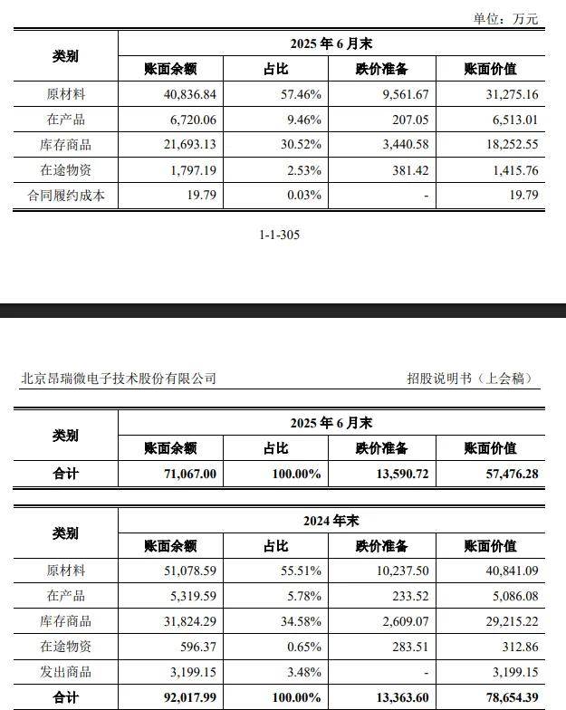 存货屡创新高。报告内,昂瑞微存货分别为4.59亿元、5.27亿元、7.87亿元、5.75亿元,存货主要以原材料、库存商品为主,期末余额分别为4.08亿元、2.17亿元,占比分别为57.46%、30.52%。