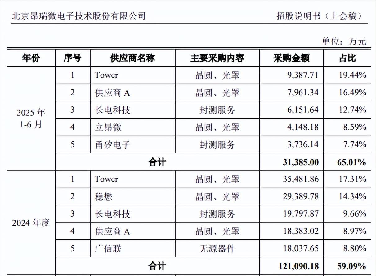 供应商集中度同样不低。报告期内,昂瑞微向前五客户的采购额分别为4.89亿元、9.29亿元、12.11亿元、3.14亿元,占比分别为62.65%、61.34%、59.09%、65.01%,包括采购晶圆、光罩、封测服务等。