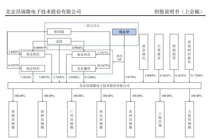 实控人表决权超62%。昂瑞微没有控股股东,实际控制人是钱永学,直接持股比例为3.86%,并通过特别表决权机制直接控制21.95%的表决权,通过北京鑫科间接控制9.12%的股份,并通过特殊表决权间接控制28.54%的表决权,通过南京创芯、南京同芯、南京科芯间接控制10.38%的表决权,通过一致行动关系控制1.56%的表决权,发行前合计控制公司62.43%的表决权。