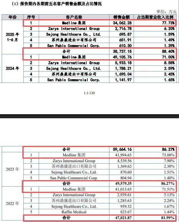 其中对第一大客户Medline集团的销售额分别为4.1亿元、4.2亿元、4.91亿元、3.41亿元,占比分别为71.51%、73.08%、71%、77.73%。