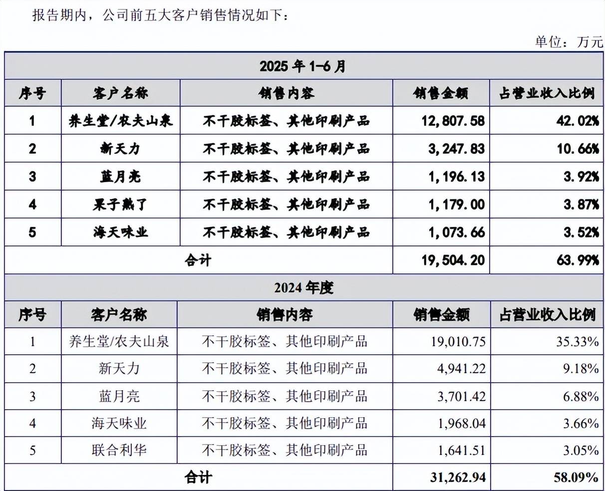 大客户、供应商依赖风险。报告期内,江天科技向前五大客户的销售占比分别为51.86%、57.9%、58.09%、63.99%,第一大客户是养生堂/农夫山泉,销售占比分别为29.4%、40.29%、35.33%、42.02%,对应的销售金额分别为1.13亿元,2.05亿元、1.9亿元、1.28亿元,销售产品是不干胶标签、其他印刷产品。