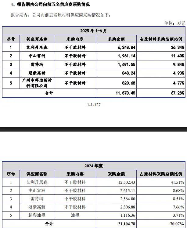 事实上,江天科技向前五大供应商的采购比例同样不低,采购占比分别为74.62%、70.47%、70.07%、67.28%,其中对第一大供应商艾利丹尼森的采购占比分别为44.99%、40.24%、41.51%、36.34%,对应的采购金额分别为0.97亿元、1.14亿元、1.25亿元、0.62亿元,采购内容是不干胶材料。