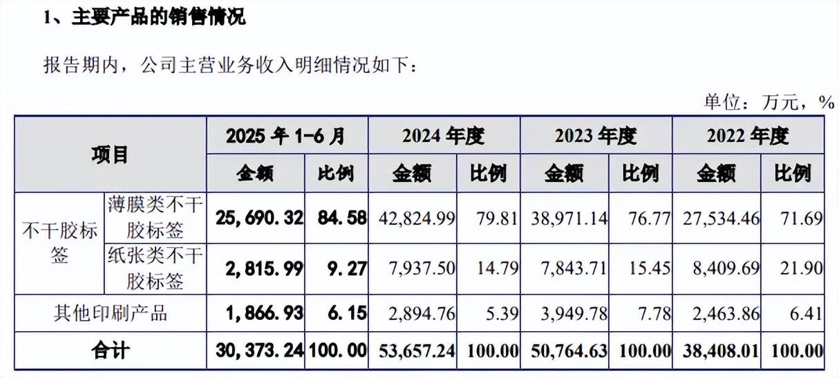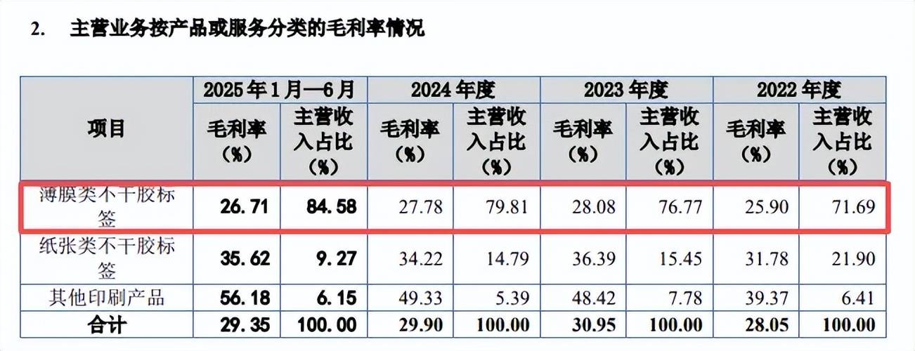 虽然薄膜类不干胶标签收入稳增,但单价下滑明显,分别为7.98元、6.96元、6.71元、5.84元,对应的毛利率分别为25.9%、28.08%、27.78%、26.71%,从2023年以来持续下滑,直接影响了综合毛利率,分别为28.05%、30.95%、29.97%和29.44%。