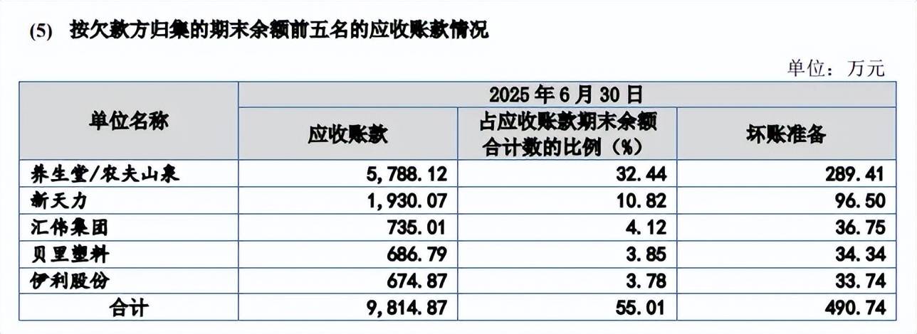 期末应收账款前五名客户分别为养生堂/农夫山泉、新天力、汇伟集团、贝里塑料以及伊利股份,对应的金额分别为5,788.12万元、1,930.07万元、735.01万元、686.79万元、以及674.87万元。