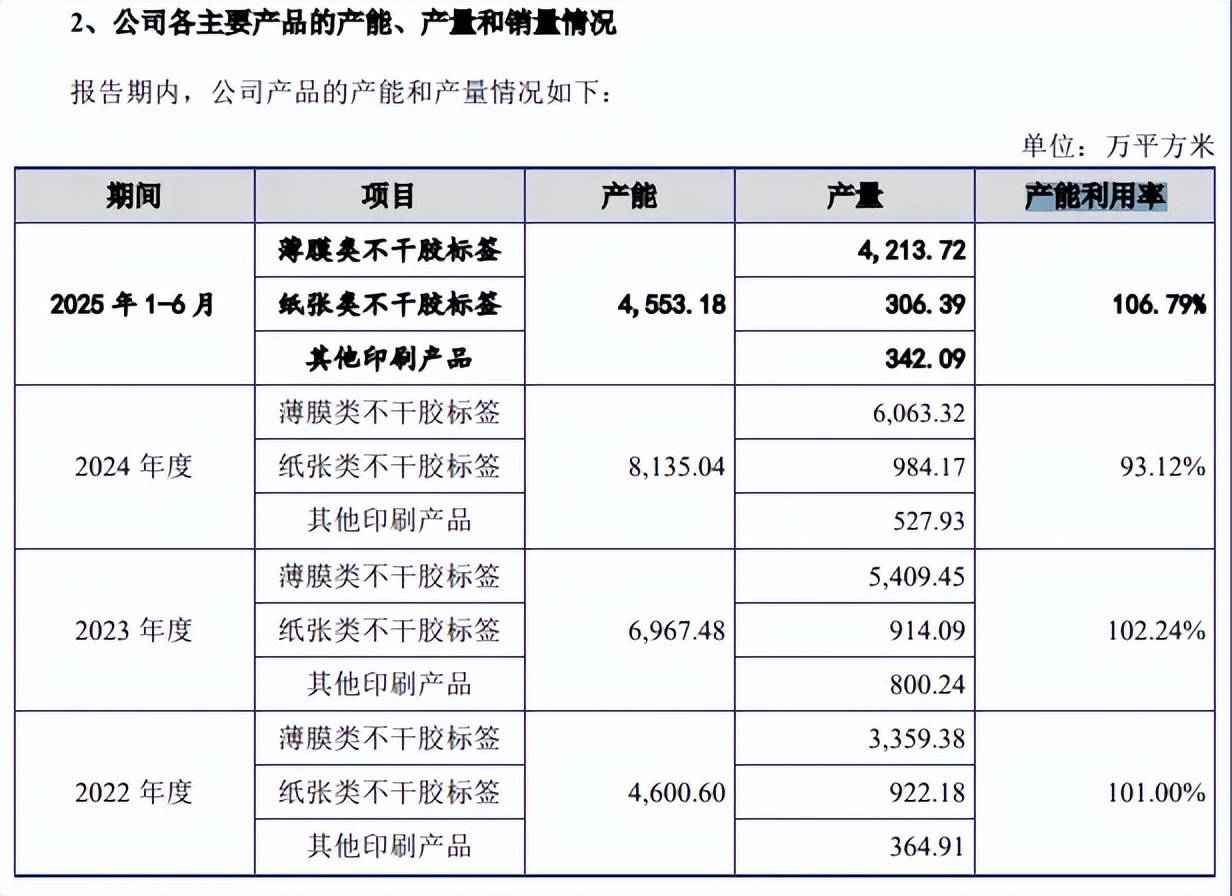 2022年至2025年1-6月(报告期内),公司产能分别为4,600.60万平方米、6,967.48万平方米、8,135.04万平方米、4,553.18万平方米,产能利用率分别为101%、102.24%、93.12%、106.79%,基本处于满产状态。