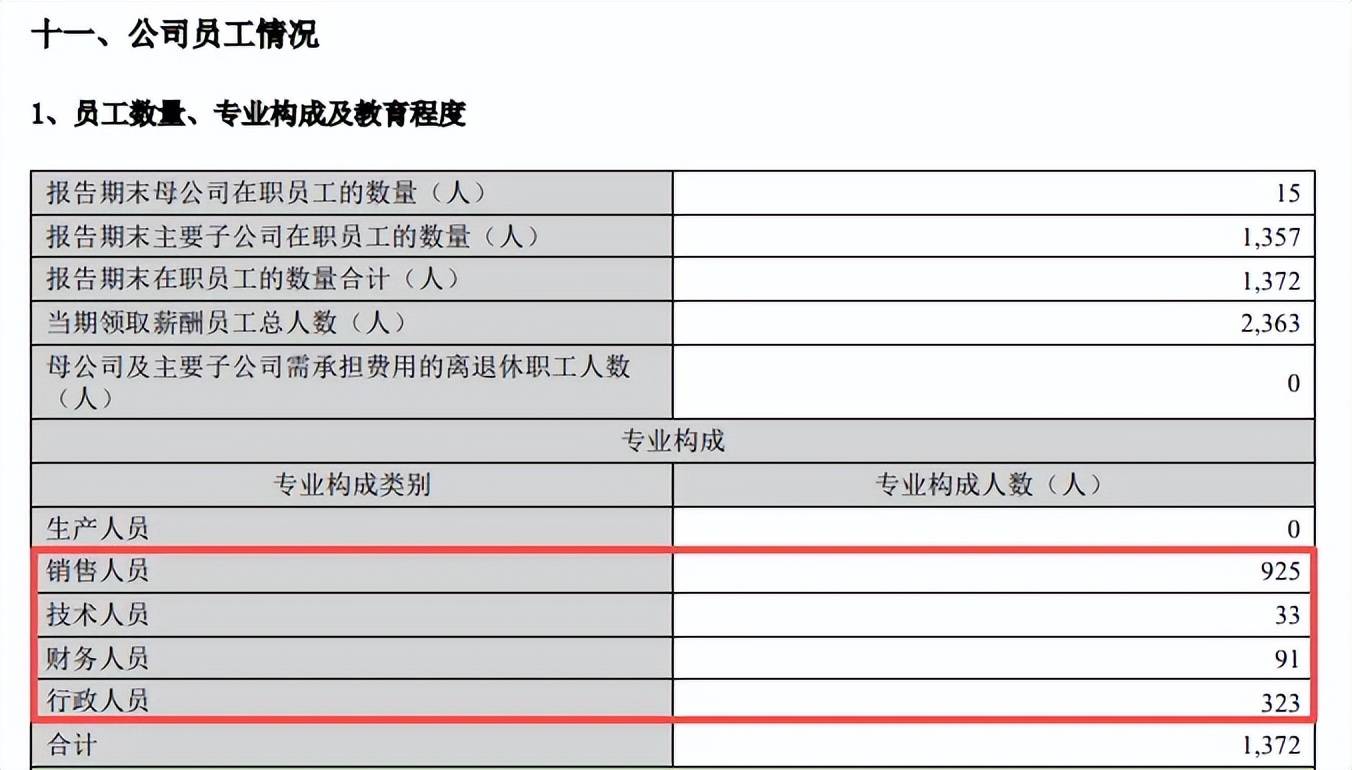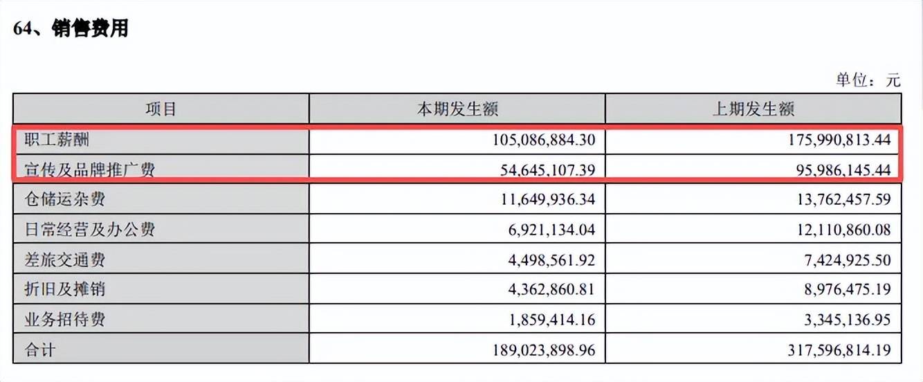 具体来看,宣传及品牌推广费1.34亿元,同比减少0.6亿元,降幅29.77%;职工薪酬2.85亿元,同比减少0.6亿元,降幅17.31%,去年末销售人员为925人,同比大幅减少425人。
