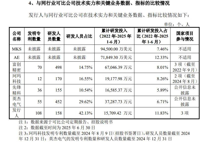 报告期内累计研发投入1.57亿元,研发费用率11.83%,不过公司研发费用投入在诸多同行中处于垫底,MKS、AE累计研发投入分别为9.45亿美元、7.18亿美元,而富创精密、珂玛科技、先锋精科、英杰电气累计研发投入分别为6.7亿元、1.92亿元、1.66亿元、3.73亿元,相关研发费用率落后于公司。