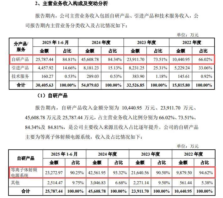 分产品来看,恒运昌收入主要由自研产品、引进产品、技术服务贡献,其中自研产品贡献收入大头,2024年收入4.56亿元,占比84.81%。进一步来看,自研产品包括等离子体射频电源系统以及其他,其中等离子体射频电源系统是收入贡献大头,报告期实现收入分别为0.99亿元、2.16亿元、4.26亿元、2.33亿元,占比均在90%以上,2024年及今年上半年占比分别为93.32%、90.25%。