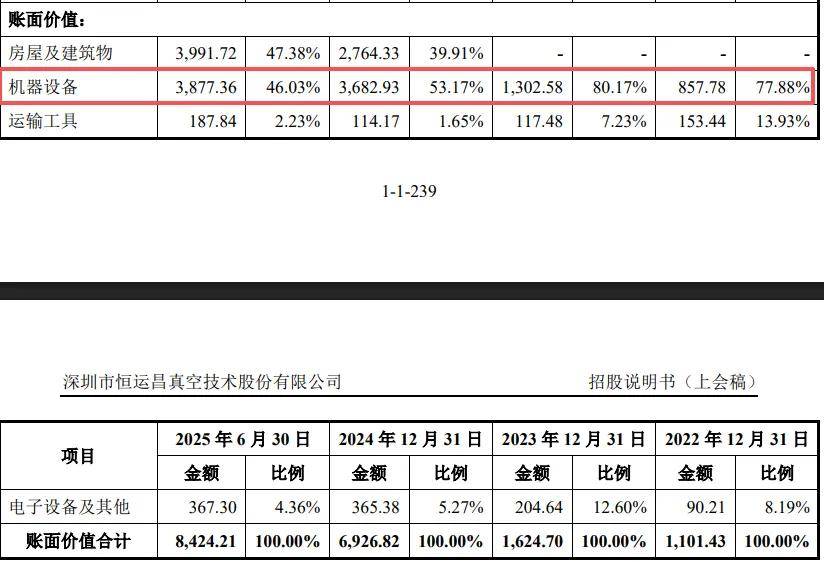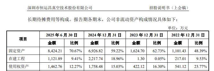 据招股书,2024年固定资产、在建工程金额大涨与子公司沈阳恒运昌于2024年开始投资建设,新增购置厂房和机器设备有关,进一步来看,固定资产中的机器设备账面价值分别为857.78万元、1,302.58万元、3,682.93万元、3,877.36万元,2023年、2024年分别增长51.85%、182.74%。