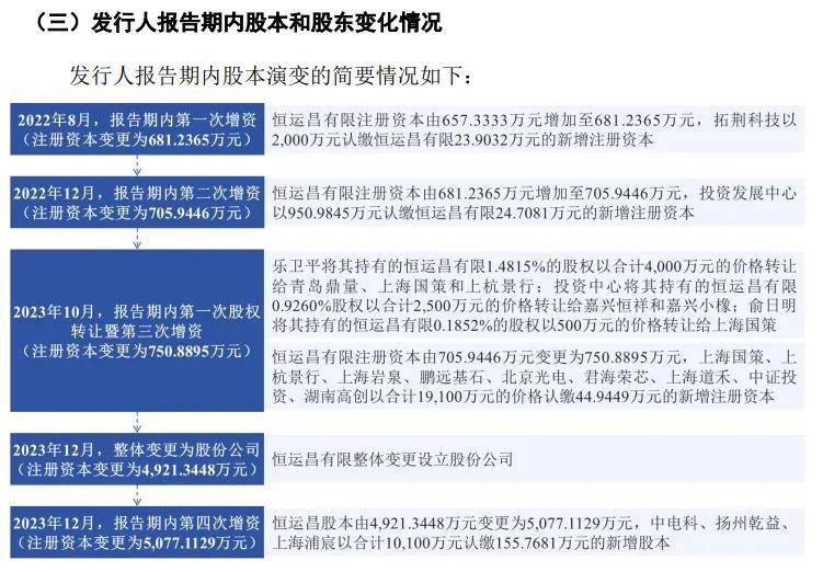 在2023年12月完成股份制改革后,恒运昌在当月完成第四轮融资,中电科、扬州乾益、上海浦宸以1.01亿元认购155.77万元新增注册资本。