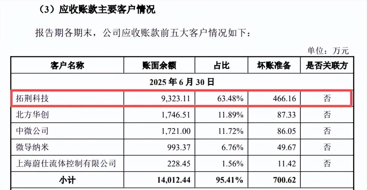 应收账款第一欠款方是拓荆科技,报告期内账面余额分别为685.58万元、5,005.48万元、4,653.66万元、9,323.11万元,坏账准备分别为34.28万元、250.27万元、232.68万元、466.16万元。