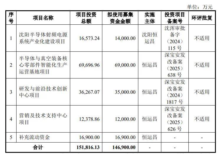 据短平快解读了解,本次IPO,恒运昌拟公开发行不超过1,693.0559万股,拟募集资金14.69亿元,用于沈阳半导体射频电源系统产业化建设项目(沈阳项目)、半导体与真空装备核心零部件智能化生产运营基地项目(深圳项目)、研发与前沿技术创新中心项目(研发创新项目)、营销及技术支持中心项目、补充流动资金,拟投入募集资金分别为1.4亿元、6.9亿元、3.5亿元、1.2亿元、1.69亿元。