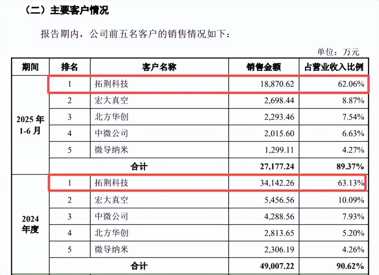 单一客户贡献收入超六成。报告期内,恒运昌来自前五大客户销售收入占主营业务收入的比例分别为73.54%、80.39%、90.62%及89.37%,收入主要由第一大客户拓荆科技贡献,销售额分别为0.72亿元、1.89亿元、3.41亿元、1.89亿元,占比分别为45.23%、58.16%、63.13%及62.06%,存在单一客户贡献收入超五成的情况。