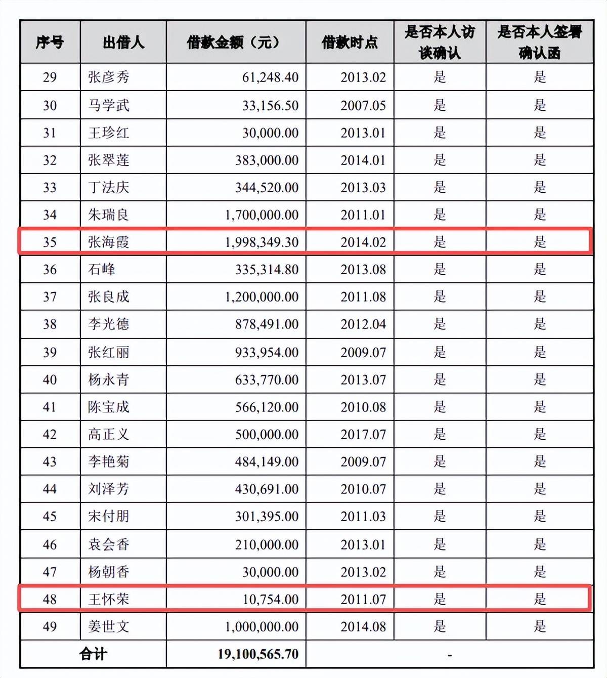 高频率向个人借款。据问询函,农大科技存在向个人借款的情形,2007年至2015年,累计向49人借款1910.06万元,金额低至10,754元,高至198.83万元,后者出借人是张海霞,系山东农业大学教师朱瑞良的配偶,众多借款未签署书面借款协议,目前实际控制人马学文已归还全部借款本金和利息。