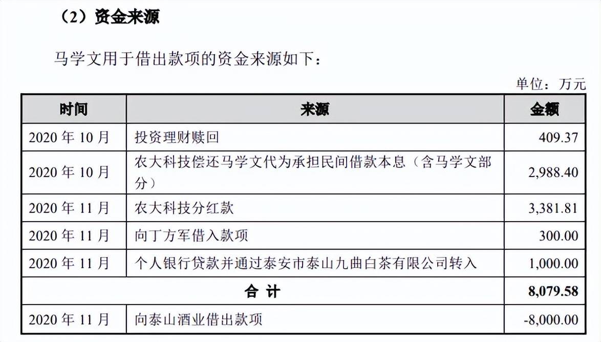 实际上,马学文借出的8000万元来源多种多样,其中投资理财、农大科技偿还马学文代为承担民间借款本息(含马学文部分)、农大科技分红款、向丁方军借入款项以及个人银行贷款并通过泰安市泰山九曲白茶有限公司转入,金额分别为409.37万元、2,988.40万元、3,381.81万元、300.00万元、以及1,000.00万元。