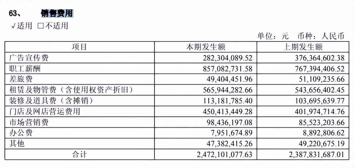 门店及网店营运费用、广告宣传费紧随其后,中报分别为4.5亿元、2.82亿元,前者同比增长12.05%,后者同比大幅下滑24.99%。据短平快解读了解,门店及网店营运费用包括实体门店相关费用、电商渠道相关费用,2023年分别为3.38亿元、5.46亿元,同比分别增长10.33%、50.68%,显然公司该时间段猛攻电商渠道。