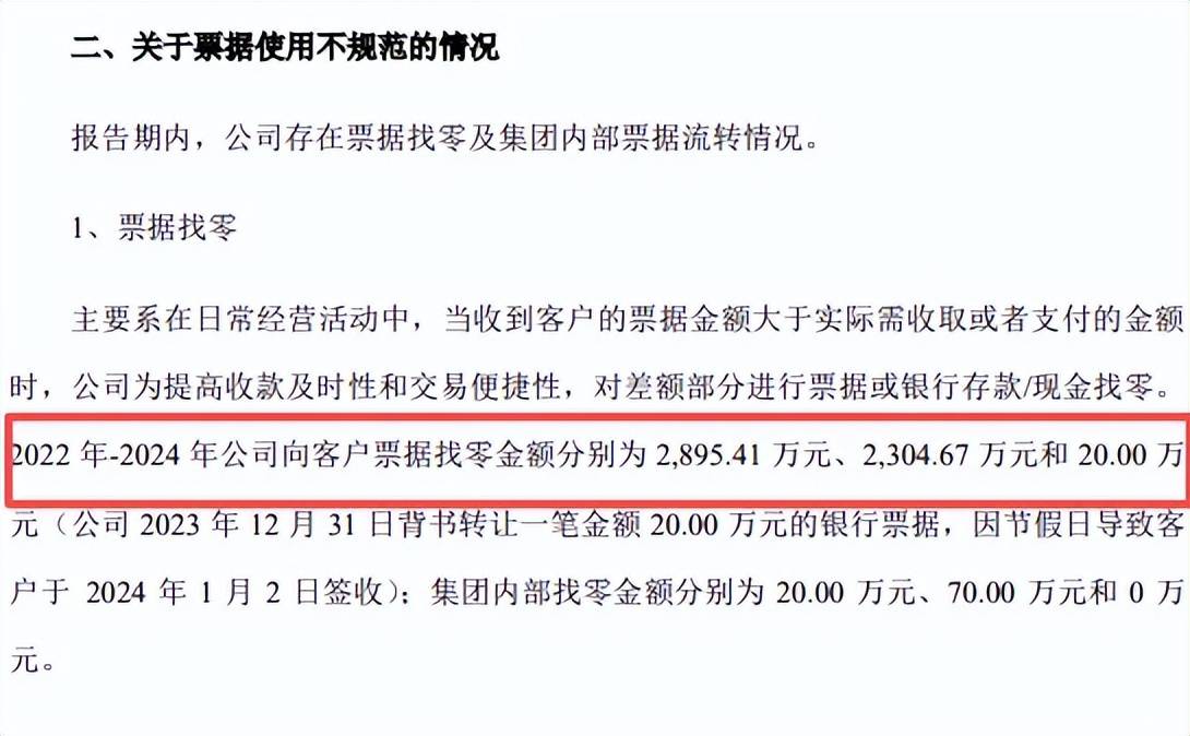 2022年至2025年1-6月(报告期),公司第三方回款金额分别为分别为0.00万元、73.73万元、19.33万元和44.43万元,公司称主要系客户基于付款安排,由客户关联方代为付款;2022年至2024年,公司向客户票据找零金额分别为2,895.41万元、2,304.67万元和20.00万元,集团内部找零金额分别为20.00万元、70.00万元和0万元。