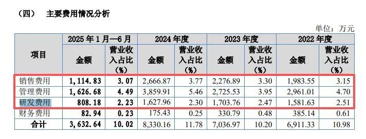 对比自身,研发费用远远落后于销售费用、管理费用,以2024年为例,两大费用分别为2,666.87万元、3,859.91万元,对应的费用率分别为3.77%、5.46%。