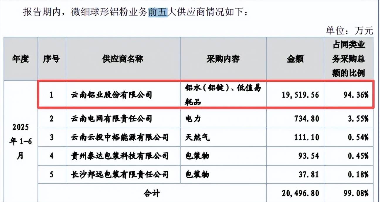 供应商集中度高。报告期内,族兴新材微细球形铝粉原材料主要向云南铝业股份有限公司采购,采购额分别为3.83亿元、3.92亿元、3.95亿元、1.95亿元,占比分别为91.52%、93.69%、93.89%、94.36%,采购内容包括铝水(铝锭)、低值易耗品。