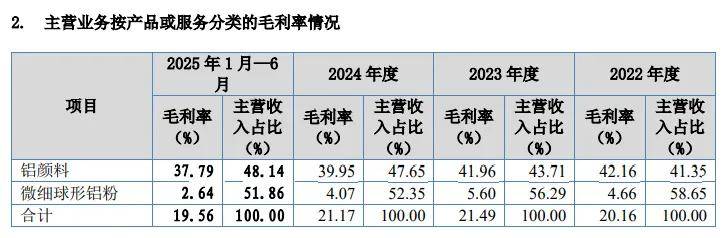 需要指出的是,铝颜料报告期内毛利率连降,分别为42.16%、41.96%、39.95%和37.79%,不排除未来继续下降的可能性,而微细球形铝粉毛利率较低,总体呈现下滑态势,分别为4.66%、5.6%、4.07%、2.64%。