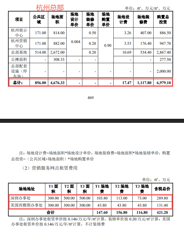 据问询函,杭州总部场地费用金额高达6,979.10万元,约是场地购置及租赁费用的94.31%,而深圳办事处、美国西雅图办事处拟投入金额分别为289.8万元、131.4万元。