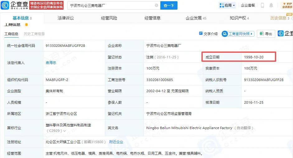 事实上,袁海忠还存在履历瑕疵,招股书显示,1994年10月至2016年11月,其担任宁波市北仑三菱电器厂法定代表人、厂长、负责人,但企查查显示,该公司成立日期为1998年10月,为何其在公司未成立之前就在里面任职了?是需要对外解释说明的。