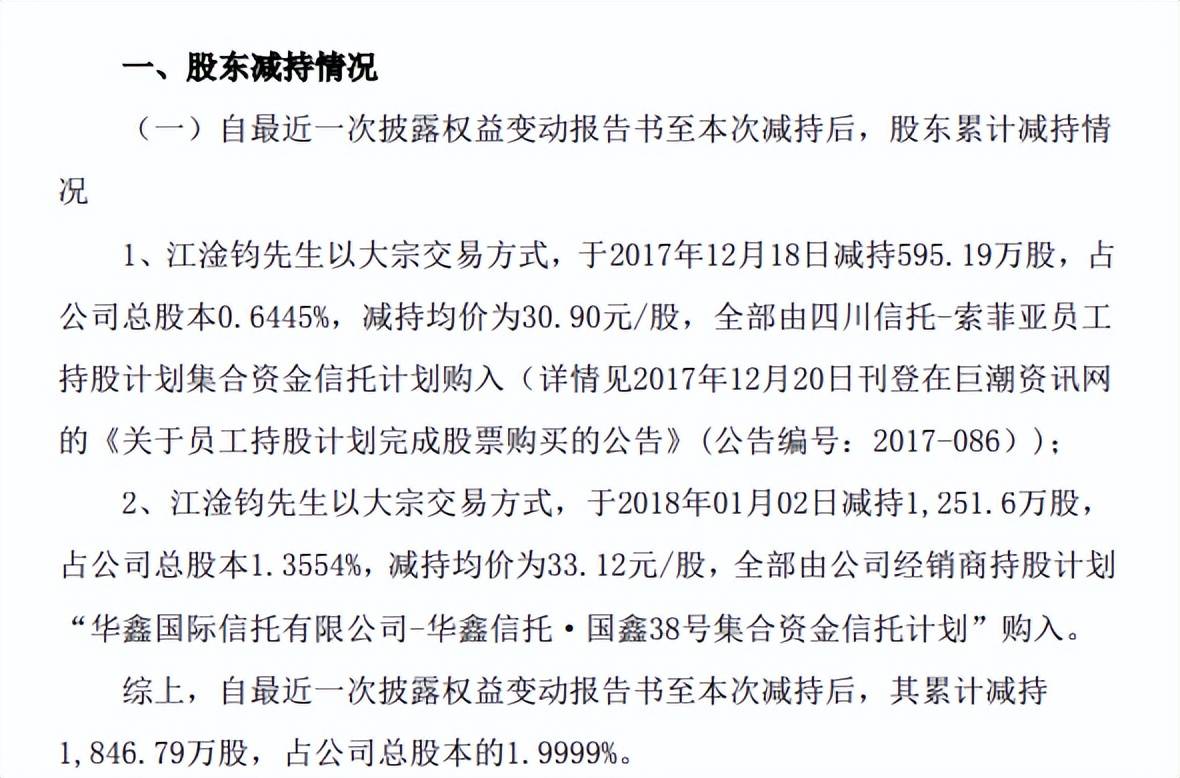 事实上,江淦钧、柯建生近年来鲜有减持,其中江淦钧上一次减持发生在2017年12月、2018年1月,通过大宗交易方式将1,846.79万股(占比1.9999%)转让给四川信托-索菲亚员工持股计划集合资金信托、华鑫国际信托有限公司-华鑫信托·国鑫38号集合资金信托计划(经销商持股计划),套现金额约5.98亿元,此举为支持员工、经销商持股计划。