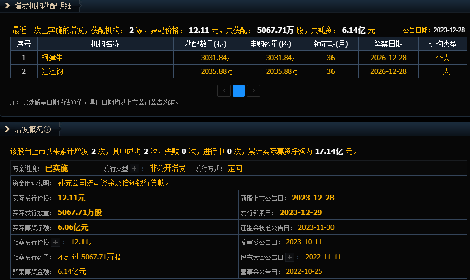 据短平快解读了解,2022年10月,索菲亚启动定增,用于补充流动资金及偿还银行贷款,实际控制人江淦钧、柯建生参与认购,最终认购数量分别为2035.88万股、3031.84万元,每股价格12.11元,即两人分别约认购2.47亿元、3.67亿元,合计6.14亿元,解禁期为2026年12月28日,公司实际募资净额6.06亿元。