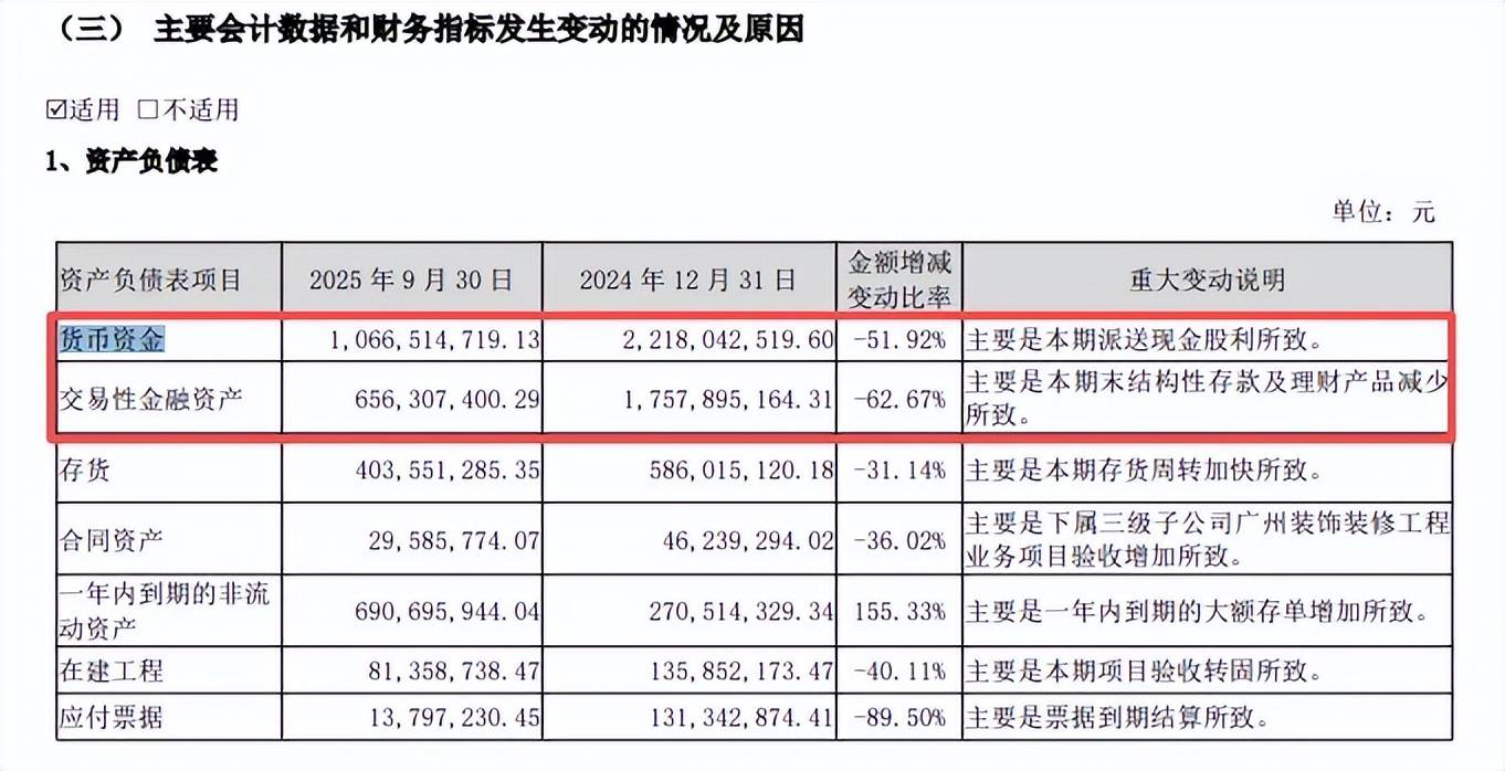 另一方面,索菲亚近两年总现金(货币资金+交易性金融资产等)分别为42.77亿元、39.76亿元,前三季度仅为17.23亿元,较年初减少2.53亿元,其中货币资金从年初22.18亿元下滑至10.67亿元,公司称主要是本期派送现金股利所致(现金分红9.63亿元);而交易性金融资产则从17.58亿元下滑至6.56亿元,公司称主要是本期末结构性存款及理财产品减少所致。