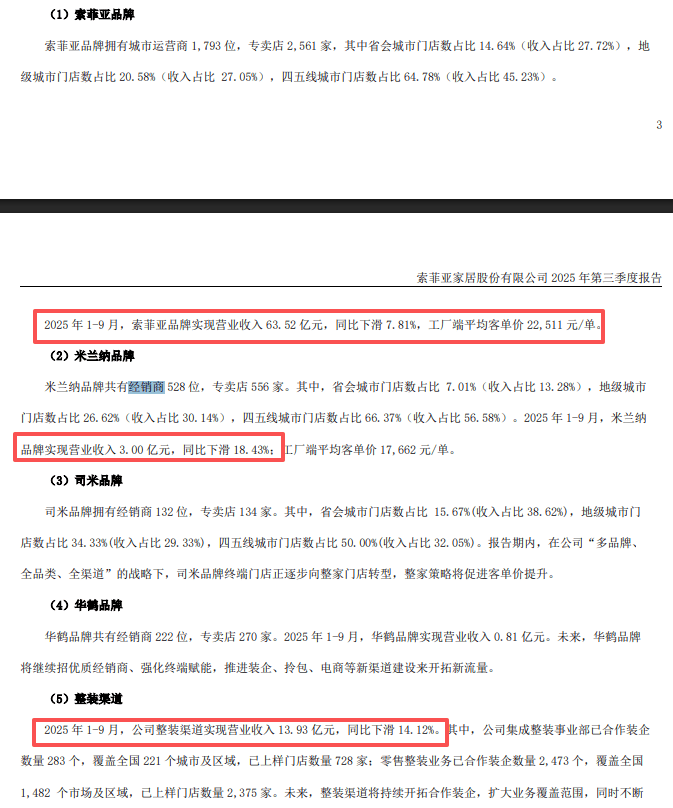 虽然品牌众多,但收入贡献大头仍然是索菲亚品牌,前三季度实现收入63.52亿元,同比下滑7.81%,工厂端平均客单价22,511元/单,而2024年客单价为23,370元/单。