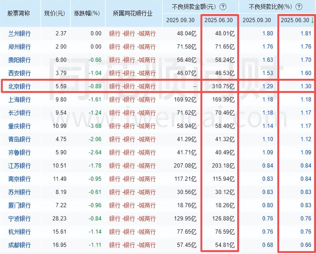 对比来看,公司中报不良贷款规模在A股17家城商行中排在首位,与第二、倒数第一的江苏银行(203.18亿)、厦门银行(18.26亿)分别相差107.57亿元、292.49亿元;不良贷款率排在第五名,仅次于兰州银行、郑州银行、贵阳银行、西安银行,后者分别为1.81%、1.76%、1.7%、1.6%。