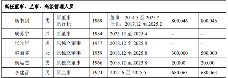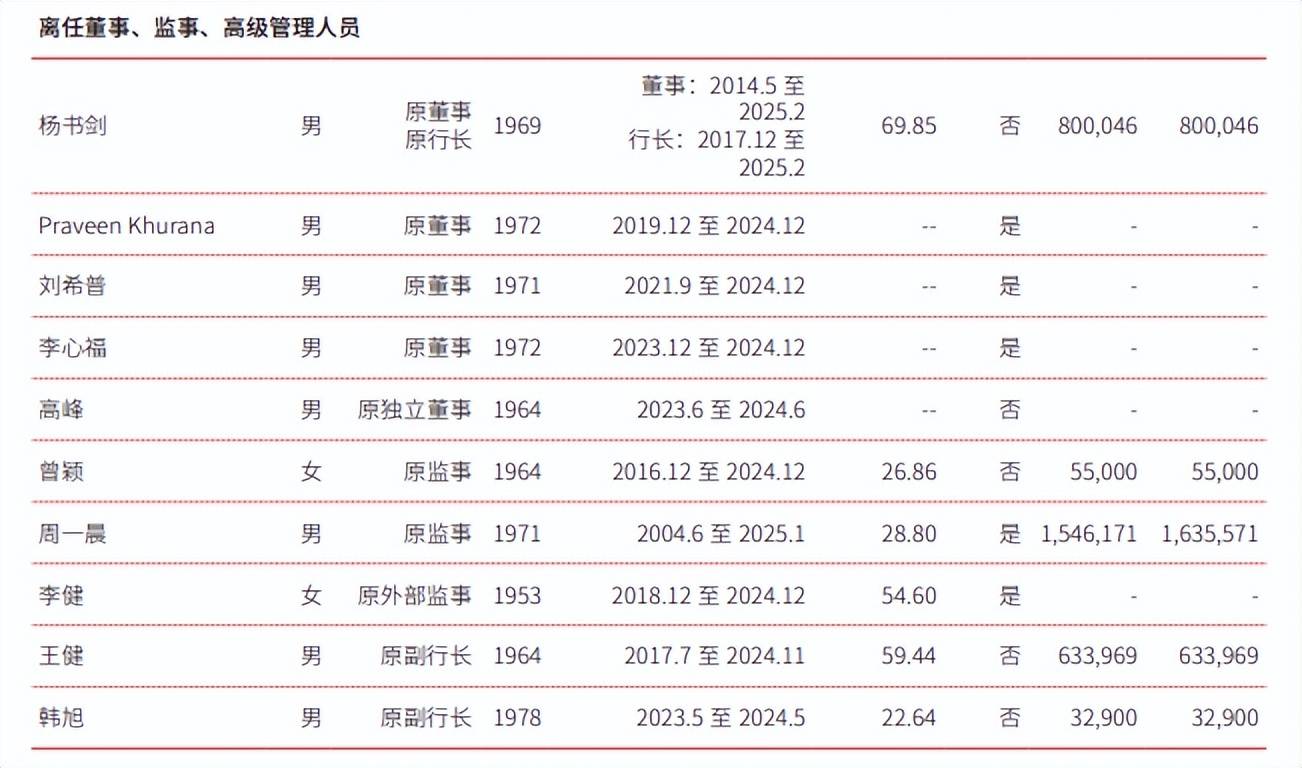 据短平快解读了解,进入2025年,公司人事调整还在继续,1月,原副行长JohannesHermanusdeWit因ING内部工作调整辞职,2月,原董事、原行长杨书剑因工作调整辞职,4月,原董事成苏宁辞职,8月,原独立董事张光华、赵丽芬、杨运杰辞职。