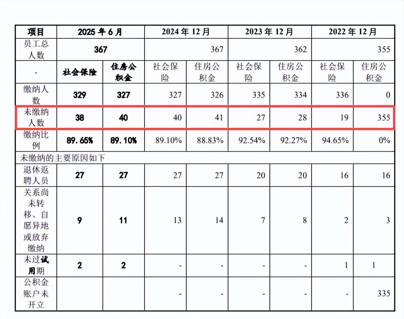 同期未缴纳公积金人数分别为355人、28人、41人、40人,即2022年未为员工缴纳公积金,未缴纳原因与社保相一致。