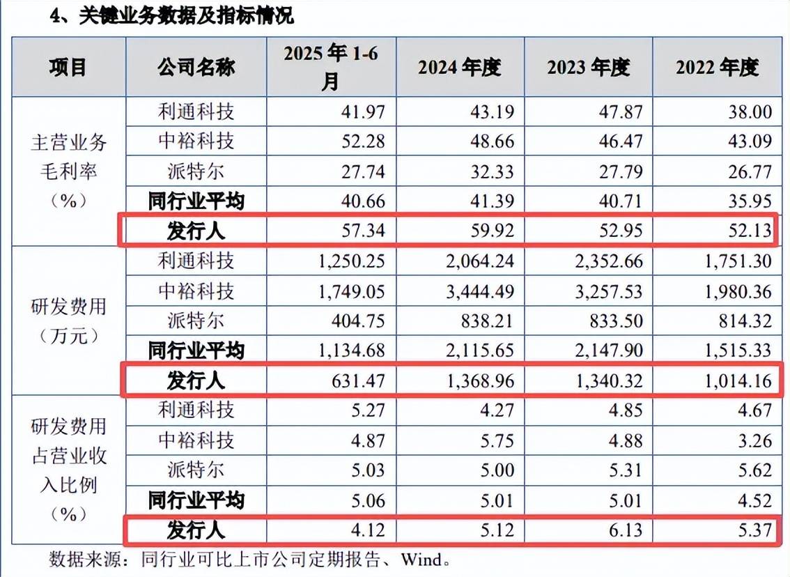 值得一提的是,公司研发费用投入并不算出色,但主营业务毛利率却是持续领先于诸多同行,且差距较大,2024年公司为59.92%,而利通科技、中裕科技、派特尔分别为43.19%、48.66%、32.33%,毛利率差距过大也引起北交所注意,要求公司分析说明发行人毛利率高于同行业可比公司的原因。