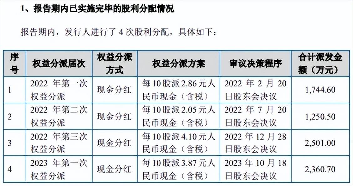 四次分红近8000万元。悦龙科技本次募投的高端软管研发中心项目、营销服务网络建设项目拟合计投入资金0.89亿元,不过公司报告期内实施4次现金分红,其中2022年分红三次,金额分别为1,744.60万元、1,250.50万元、2,501.00万元,2023年分红2,360.70万元,合计分红金额7856.8万元。