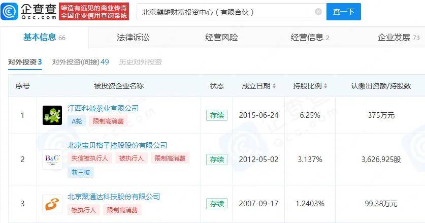 实际上,徐锦诚投资的北京麒麟财富投资中心(有限合伙)对外投资情况并不理想,投资的江西科益茶业有限公司、北京宝贝格子控股股份有限公司、北京聚通达科技股份有限公司均被限制高消费,面临着经营难题。