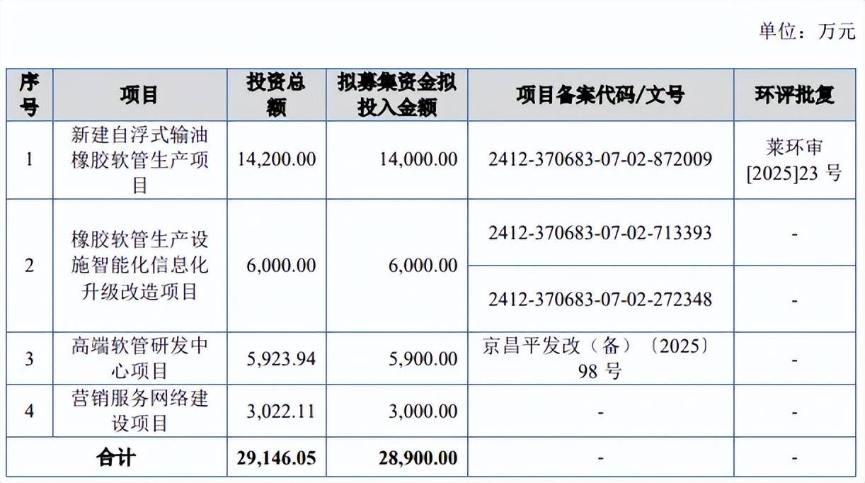 据短平快解读了解,本次IPO,悦龙科技拟公开发行不超过21,993,198股,拟募集资金2.89亿元,用于新建自浮式输油橡胶软管生产项目、橡胶软管生产设施智能化信息化升级改造项目、高端软管研发中心项目、营销服务网络建设项目,拟投入募集资金分别为1.4亿元、0.6亿元、0.59亿元、0.3亿元。