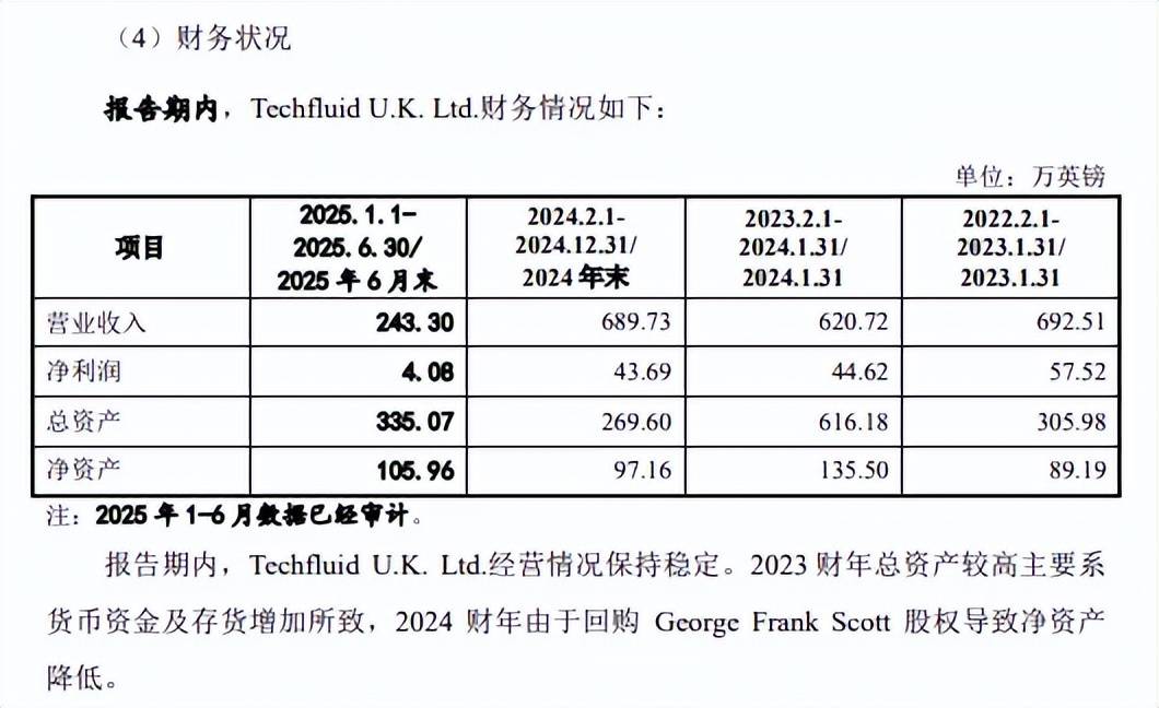 报告期内,英国泰悦实现营业收入分别为692.51万元、620.72万元、689.73万元、243.3万元,净利润分别为57.52万元、44.62万元、43.69万元、4.08万元(单位为英镑,目前1英镑等于9.39元人民币),前三年收入略有波动,而净利润则持续下滑,这点被并购后则更加明显。