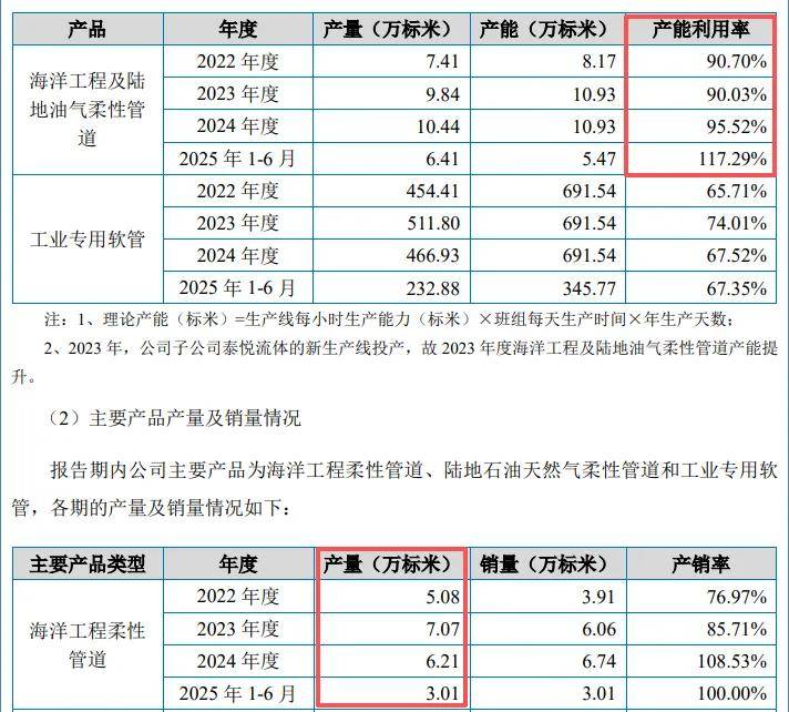 报告期内,悦龙科技海洋工程及陆地油气柔性管道产能利用率分别为90.7%、90.03%、95.52%、117.29%,2024年产能为10.93万标米,新建产能约是现有产能的60%