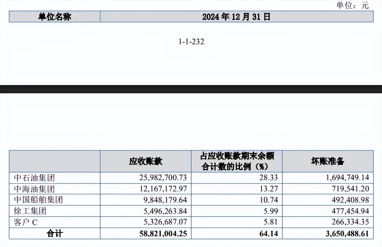 值得引起关注的是,英国泰悦近三年虽然为公司大客户,但其并不在应收账款前五名客户之列,2024年末应收账款前五名欠款方分别是中石油集团、中海油集团、中国船舶集团、徐工集团、客户C,为何大客户之一的英国泰悦历年均不在前五欠款方之列,是否符合商业逻辑,也需要引起监管层注意。
