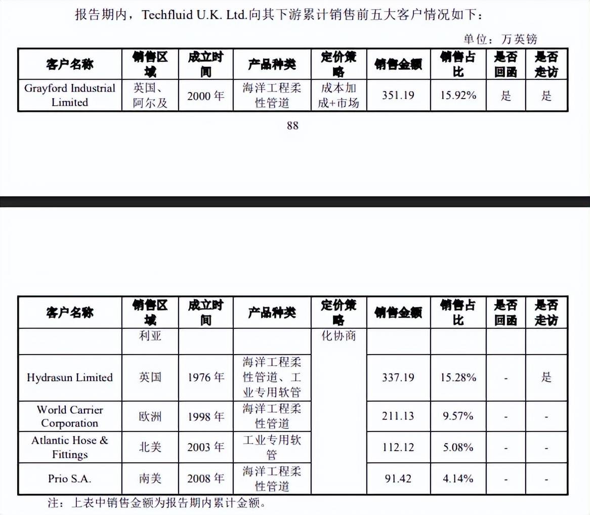 事实上,英国泰悦事件引起北交所高度关注,在两轮问询中均对该公司业绩真实性进行问询,据回复,英国泰悦向其下游累计销售的前五大客户中,WorldCarrierCorporation、AtlanticHose&Fittings、PrioS.A.三家公司不回函、也不接受走访。
