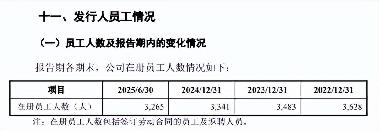 2022年至2025年1-6月(报告期),公司员工数量持续减少,分别为3,628人、3,483人、3,341人、3,265人,累计减少363人,期末员工以生产人员为主,人数、占比分别为1811人、55.47%,研发人员、占比分别为477人、14.61%。