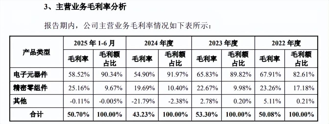 与此同时,电子元器件、精密零组件最近三年的毛利率下滑较为明显,前者分别为67.91%、65.83%、54.90%,后者分别为23.26%、22.67%%、19.69%,今年上半年的毛利率有所上升,分别为58.52%、25.16%。