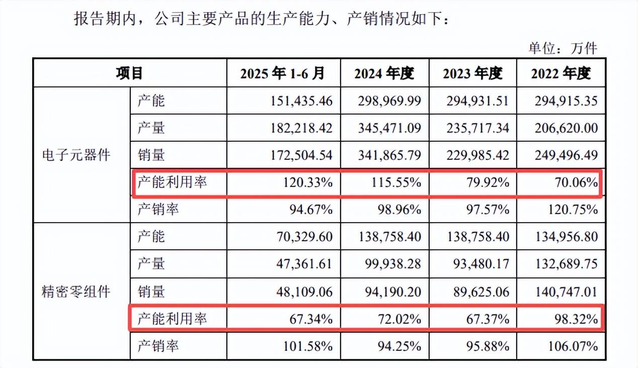 产能消化要引起注意。报告期内,宏明电子电子元器件产能利用率分别为70.06%、79.92%、115.55%、120.33%,2024年产能为298,969.99万件;精密零组件产能利用率下滑较为明显,分别为98.32%、67.37%、72.02%、67.34%,2024年产能为138,758.40万件。