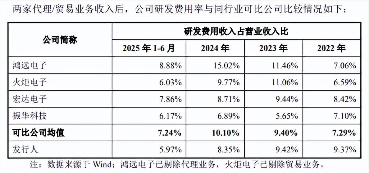 事实上,因为公司研发费用投入的降低,导致研发费用率从超越行业均值,再到落后于行业均值,2022年行业均值为7.29%,落后于公司,随后分别为9.4%、10.1%、7.24%,均超过公司,2024年,鸿远电子、火炬电子、宏达电子研发费用率分别为15.02%、9.77%、8.71%,均超过公司,仅振华科技落后于公司。另外,公司今年上半年研发费用率在这些同行中垫底,显然公司需要强化科研投入。(注:鸿远电子已剔除代理业务,火炬电子已剔除贸易业务)