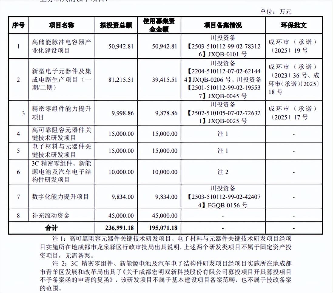 据短平快解读了解,本次IPO,宏明电子拟公开发行股票不超过3,039万股,拟募集资金19.51亿元,用于高储能脉冲电容器产业化建设项目(高储能脉冲电容器项目)、新型电子元器件及集成电路生产项目(一期/二期)(电子元器件项目)、精密零组件能力提升项目(精密零组件)、高可靠阻容元器件关键技术研发项目、电子材料与元器件关键技术研发项目、3C精密零组件、新能源电池及汽车电子结构件研发项目、数字化能力提升项目以及补充流动项目,拟投入募集资金分别为5.09亿元、3.94亿元、0.99亿元、1.5亿元、1.5亿元、1亿元、0.98亿元以及4.5亿元。