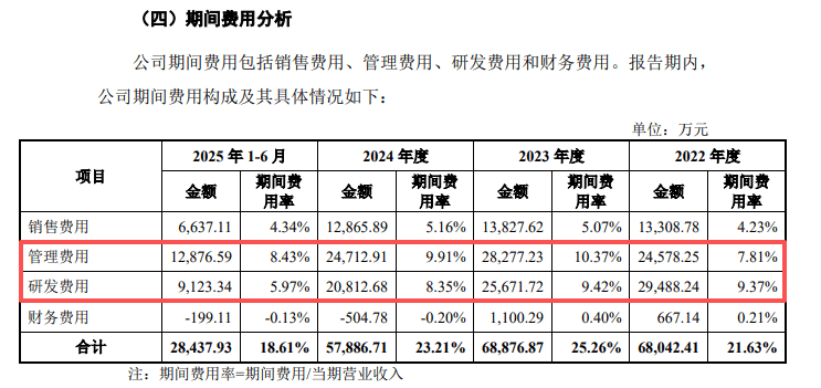 2022年,公司管理费用落后于研发费用,当年为24,578.25万元,此后实现反超,2023年至今年上半年分别为28,277.23万元、24,712.91万元、12,876.59万元,期末差值为3753.25万元。