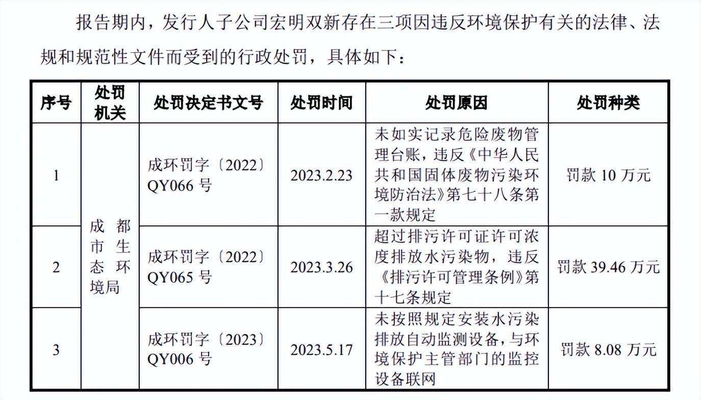 宏明双新接连遭罚。精密零组件项目实施主体是宏明电子子公司宏明双新,该公司在2023年接连遭到处罚,主要与违反环境保护的法律法规有关,2月,因未如实记录危险废物管理台账被罚款10万元;3月,因超过排污许可证许可浓度排放水污染物被罚款39.46万元;5月,因未按照规定安装水污染排放自动监测设备,与环境保护主管部门的监控设备联网被罚款8.08万元,处罚机关均为成都市生态环境局。